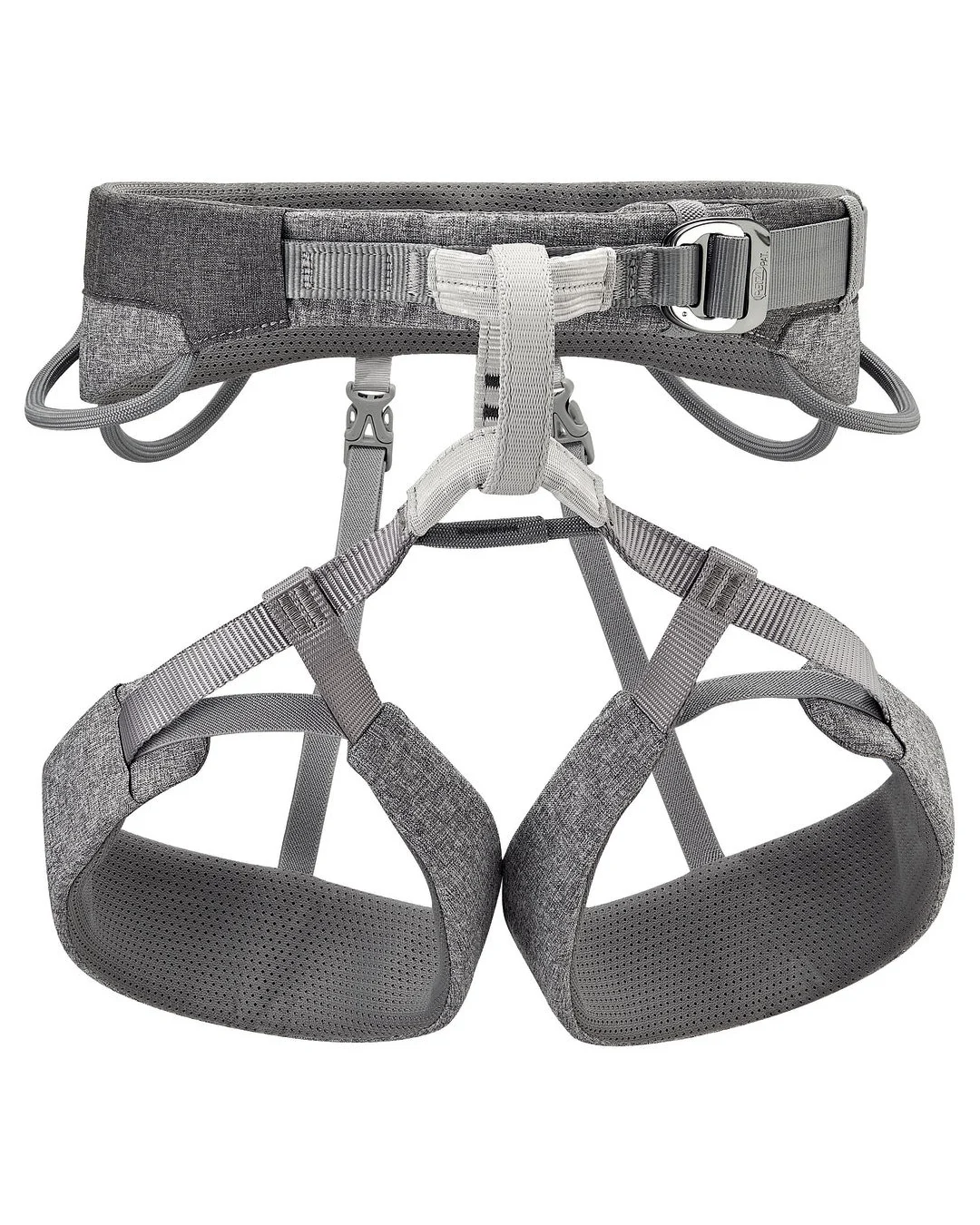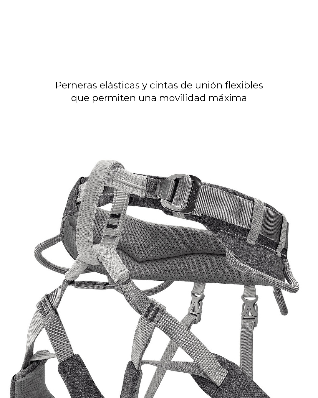 - Las perneras elásticas se ajustan perfectamente al cuerpo facilitando el confort en las caídas o mientras se está suspendido, sin restringir los movimientos durante la escalada.
