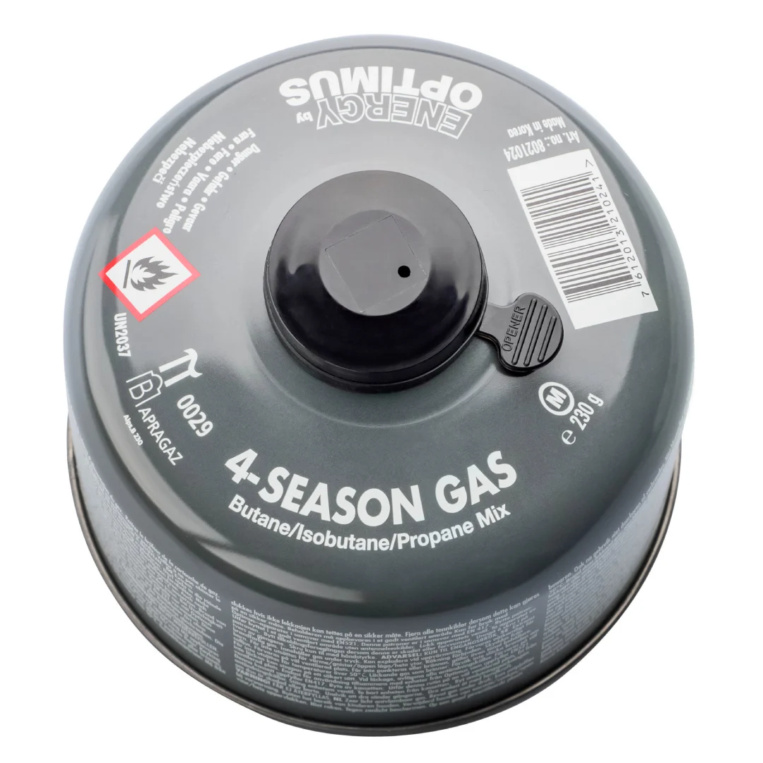 El balón de gas portátil de 4 estaciones 230gr de Optimus mantiene las cocinillas funcionando en todas las estaciones. Gracias a su mezcla premium de isobutano (70%), butano (5%) y propano (25%) ofrece un rendimiento estable en temperaturas muy bajas. El gas Optimus ha sido construido con una válvula de seguridad con autocierre, con un sistema anti-explosión y cuenta con un sello inteligente que indica si el recipiente ha sido usado previamente.