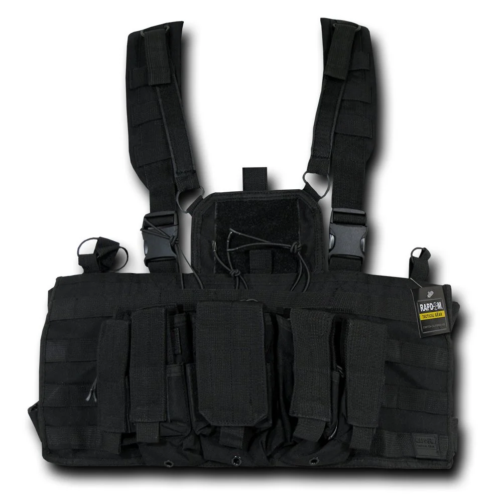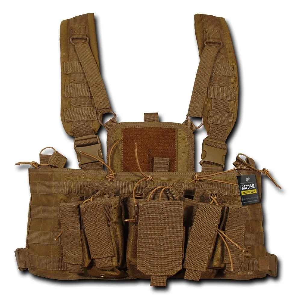 La Rápdom T600 Molle Chest Rig es una resistente alfombra en el pecho con (6) bolsas para mag de pistola, (2) bolsas ocultas de mag, (3) bolsas de doble apilado reforzadas con lengüetas de tira de bronceado, y (1) bolsa de mapa de canguro extraíble.