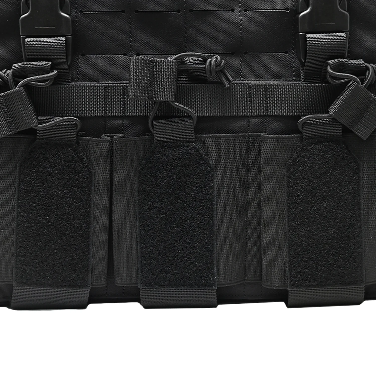 Las 3 bolsas porta cargadores ubicadas en la parte frontal diseñadas específicamente para albergar cargadores de diferentes tipos de armas, como rifles de asalto, subfusiles o pistolas. Cada bolsa está reforzada con material de alta resistencia para asegurar que los cargadores se mantengan seguros y accesibles en todo momento.