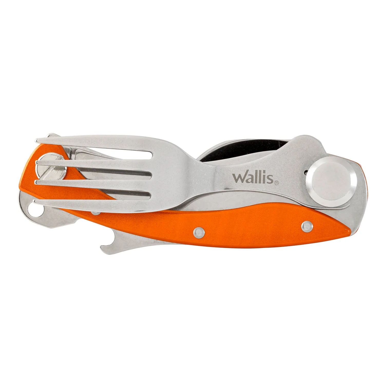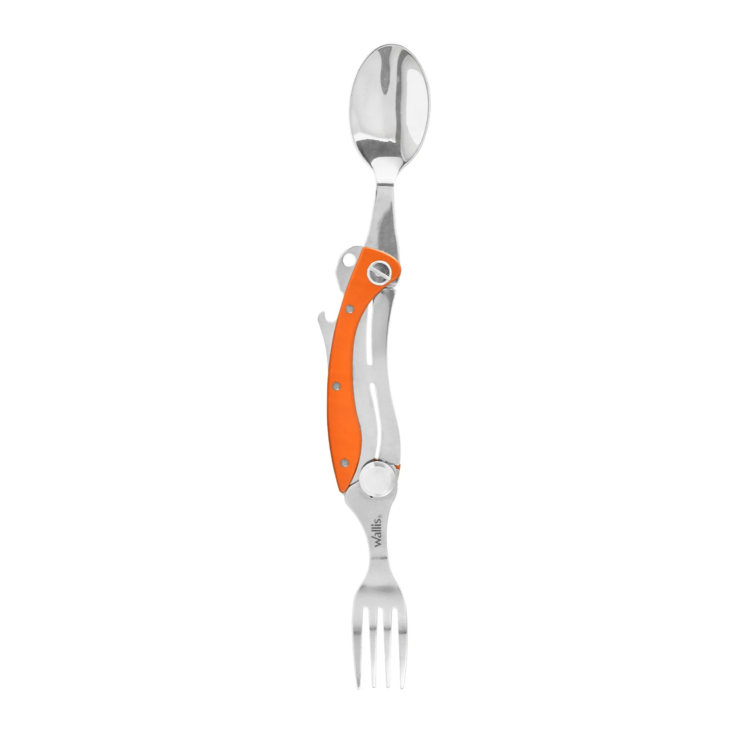 Cubiertos para campismo con 3 usos color naranja y metal. No son desprendibles por si quieres tener ambas funciones, tanto el tenedor como la cuchara siempre juntas y evitar que una de estas se te pierda. Ideal para viajes, excursiones, campismo o para tenerlo contigo en la oficina o en la escuela.