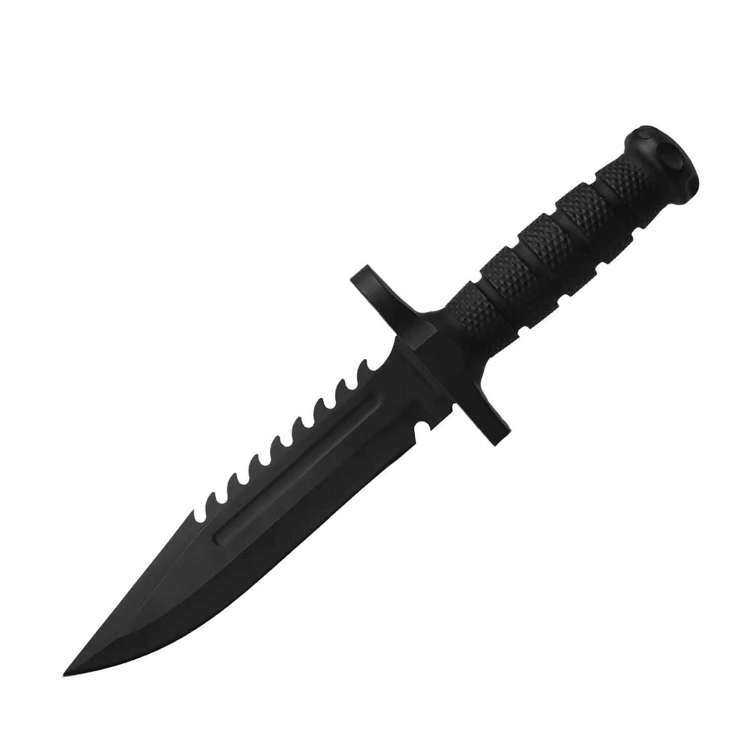 Cuchillo de combate con empuñadura texturizada y sierra para cortar.