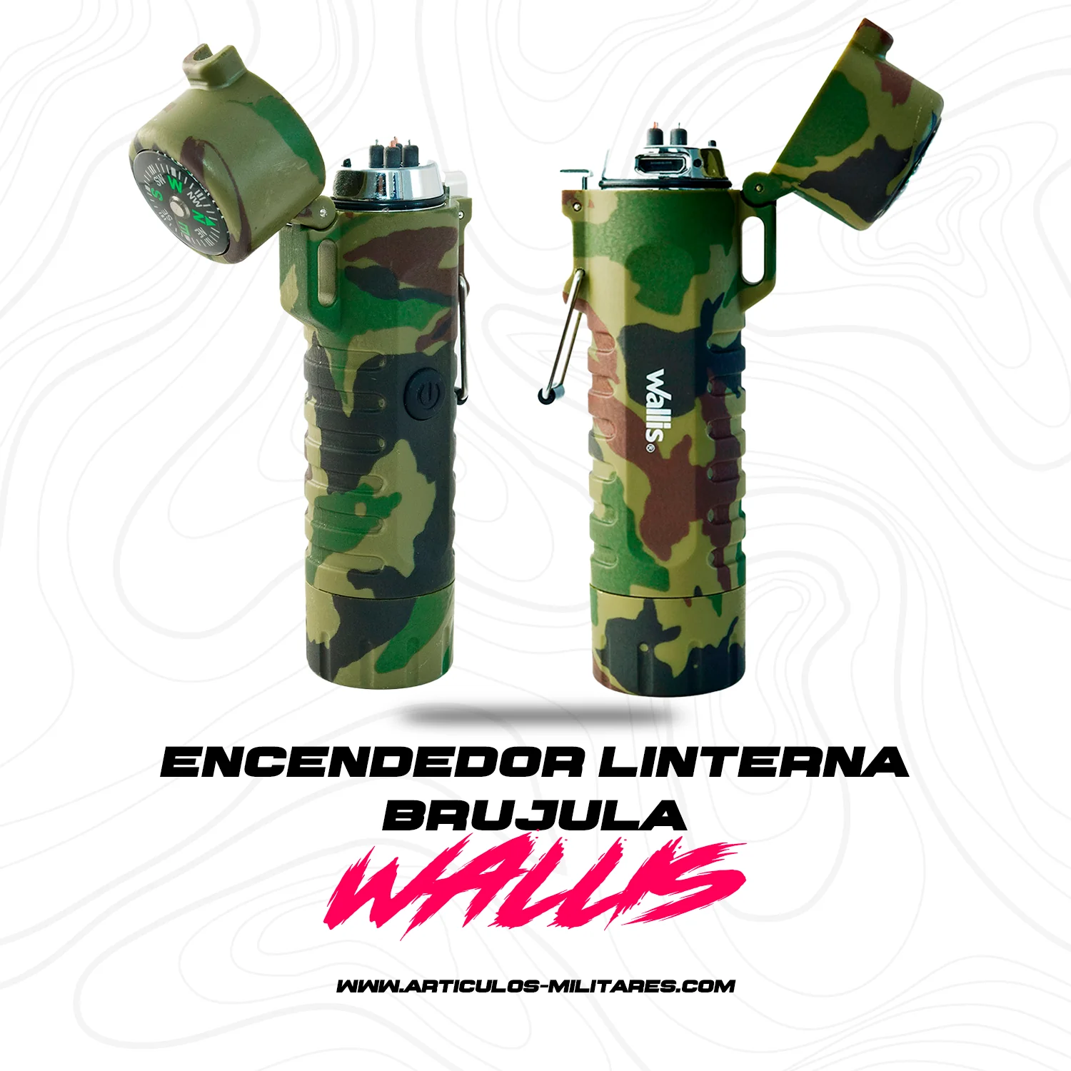 El Encendedor Electrónico USB Wallis no es solo un encendedor, es tu compañero ideal para cada aventura al aire libre. Con su doble arco electrónico, puedes encender tu fuego en cualquier lugar sin complicaciones. Además, su linterna integrada ilumina el camino cuando el sol se esconde, y su brújula te orienta con precisión en cualquier lugar que te lleve la aventura.