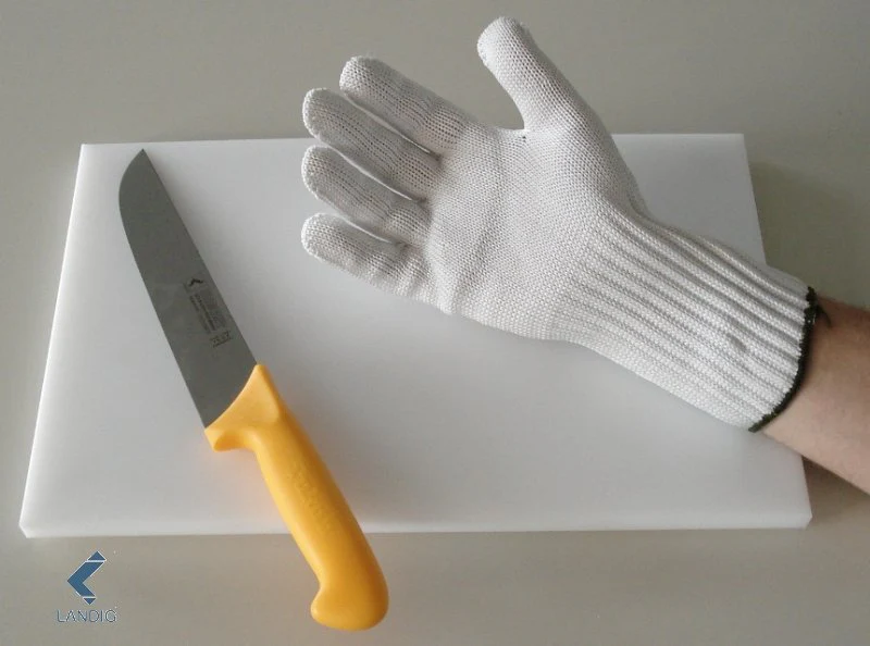 Guantes de protección contra cortes de Landig, disponibles en blanco. Diseño de resistencia de malla de acero, certificado CE (CE EN 388) nivel de protección al corte 5 , con núcleo de acero inoxidable, lavable a máquina hasta 100°C.