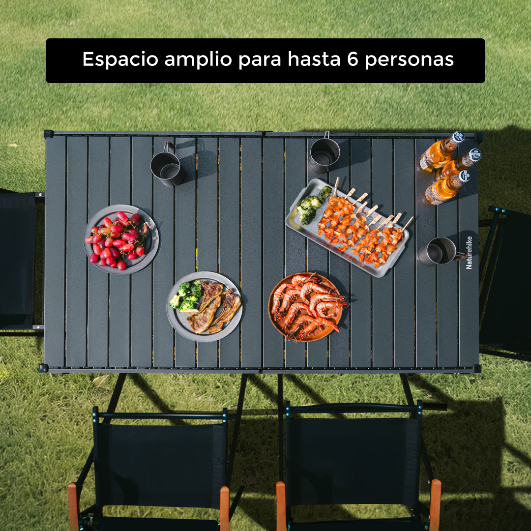 La mesa plegable Star Jane H01 Large de Naturehike está diseñada para grupos de hasta 6 personas. Ofrece una superficie amplia y tiene una altura de 73cm. Su estructura es altamente resistente y tiene un diseño plegable que facilita su transporte.