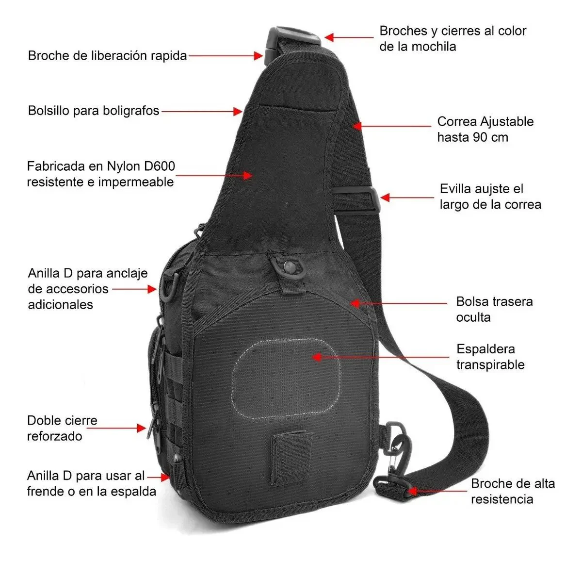 10. Largo correa: 45 hasta 90 cm ajuste.
