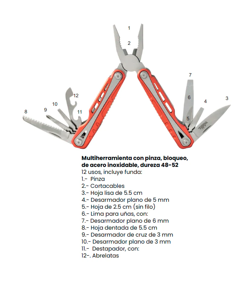 12 usos, incluye funda: 1. Pinza, 2. Cortacables, 3. Hoja lisa de 5.5 cm, 4. Desarmador plano de 5 mm, 5. Hoja de 2.5 cm (sin filo), 6. Lima para uñas, con: 7. Desarmador plano de 6 mm, 8. Hoja dentada de 5.5 cm, 9. Desarmador de cruz de 3 mm, 10. Desarmador plano de 3 mm, 11. Destapador, con: 12. Abrelatas.