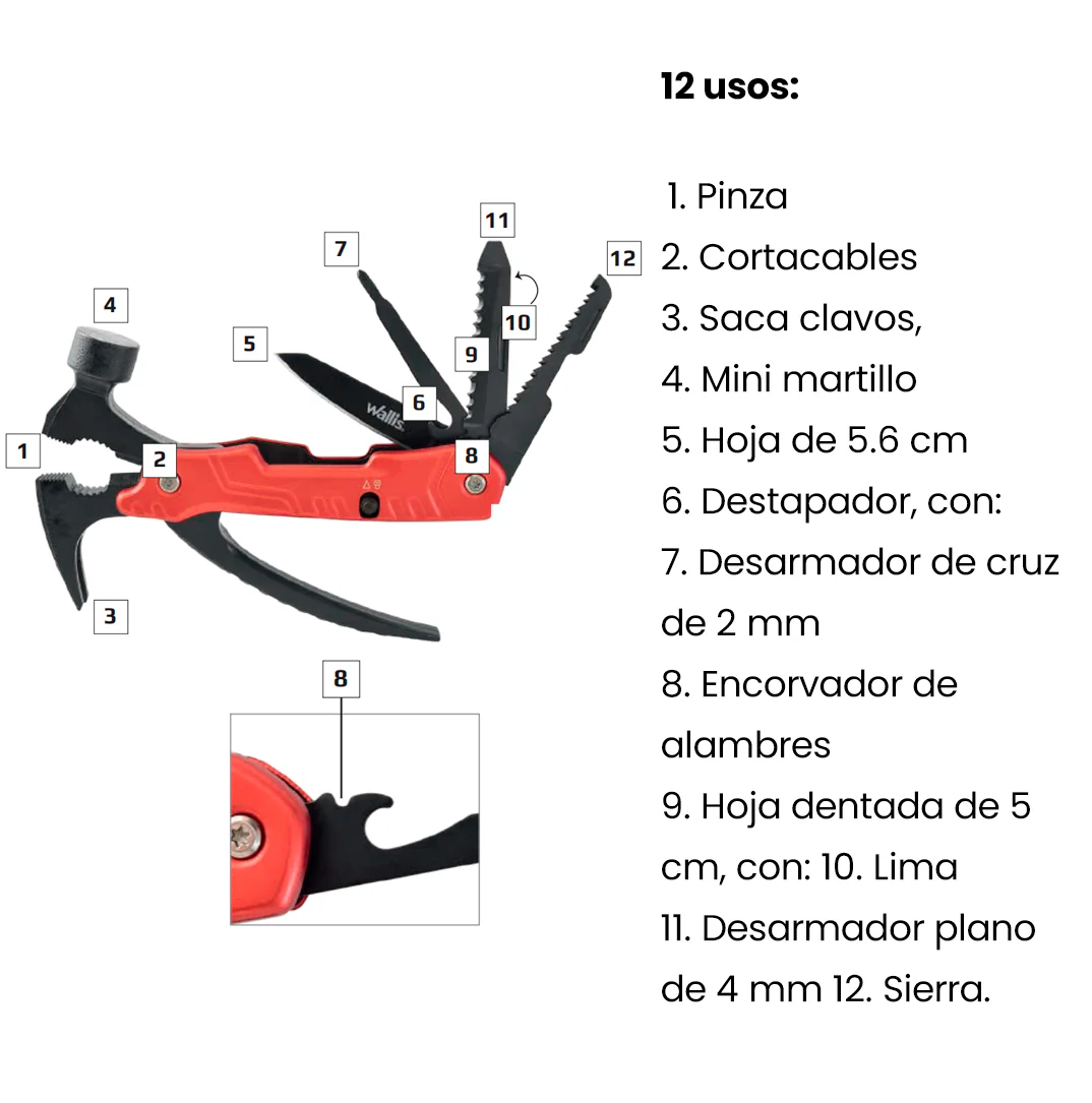 12 usos: 1. Pinza, 2. Cortacables, 3. Saca clavos, 4. Mini martillo, 5. Hoja de 5.6 cm, 6. Destapador, con: 7. Desarmador de cruz de 2 mm, y 8. Encorvador de alambres, 9. Hoja dentada de 5 cm, con: 10. Lima y 11. Desarmador plano de 4 mm y 12. Sierra.