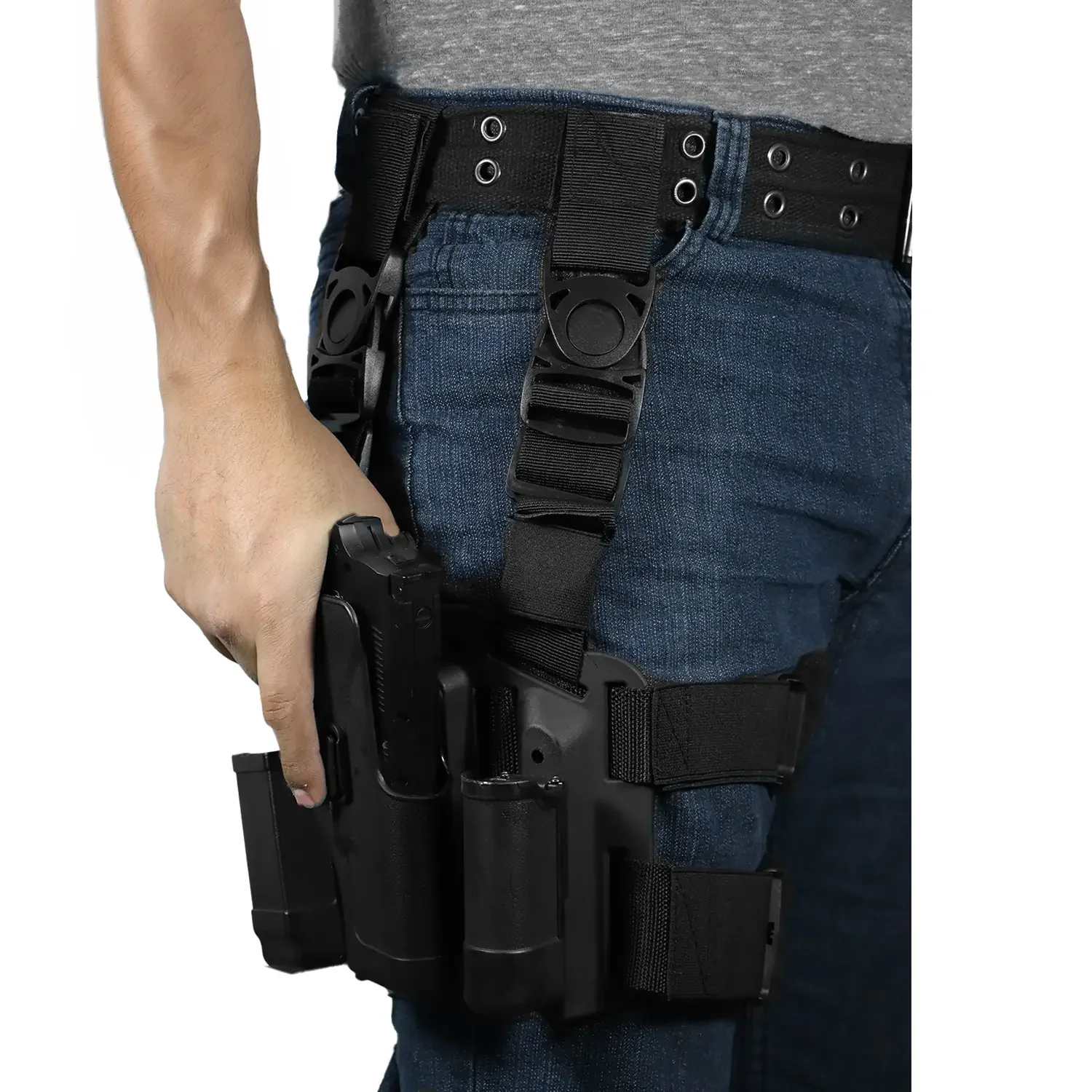**Versatilidad y Adaptabilidad:** Con un sistema de montaje ajustable, la funda permite configuraciones en diferentes ángulos para adaptarse a tus necesidades operativas y preferencias personales. Compatible con una amplia gama de cinturones y equipos tácticos, ofrece una flexibilidad superior.