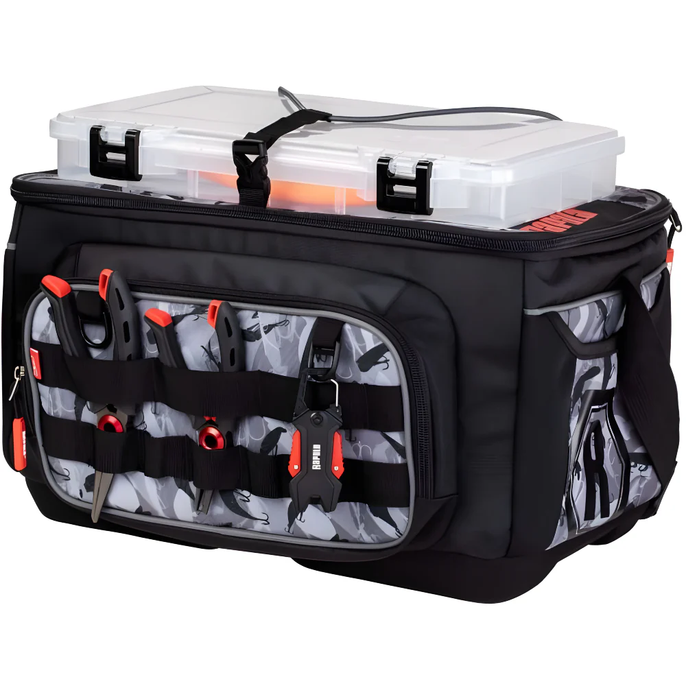 Tejido impermeable Rapala LureCamo impreso con moldeado. Fondo impermeable de EVA para mantener el agua fuera. Capacidad para cuatro cajas de señuelos de tamaño 3600 dentro de la bolsa más una en la parte superior para un acceso rápido. Bolsillo delantero con accesorio para herramientas. Bolsillos para mayor capacidad. Acolchado, hombro ajustable. Cremalleras YKK. Cajas de aparejos no incluidas.