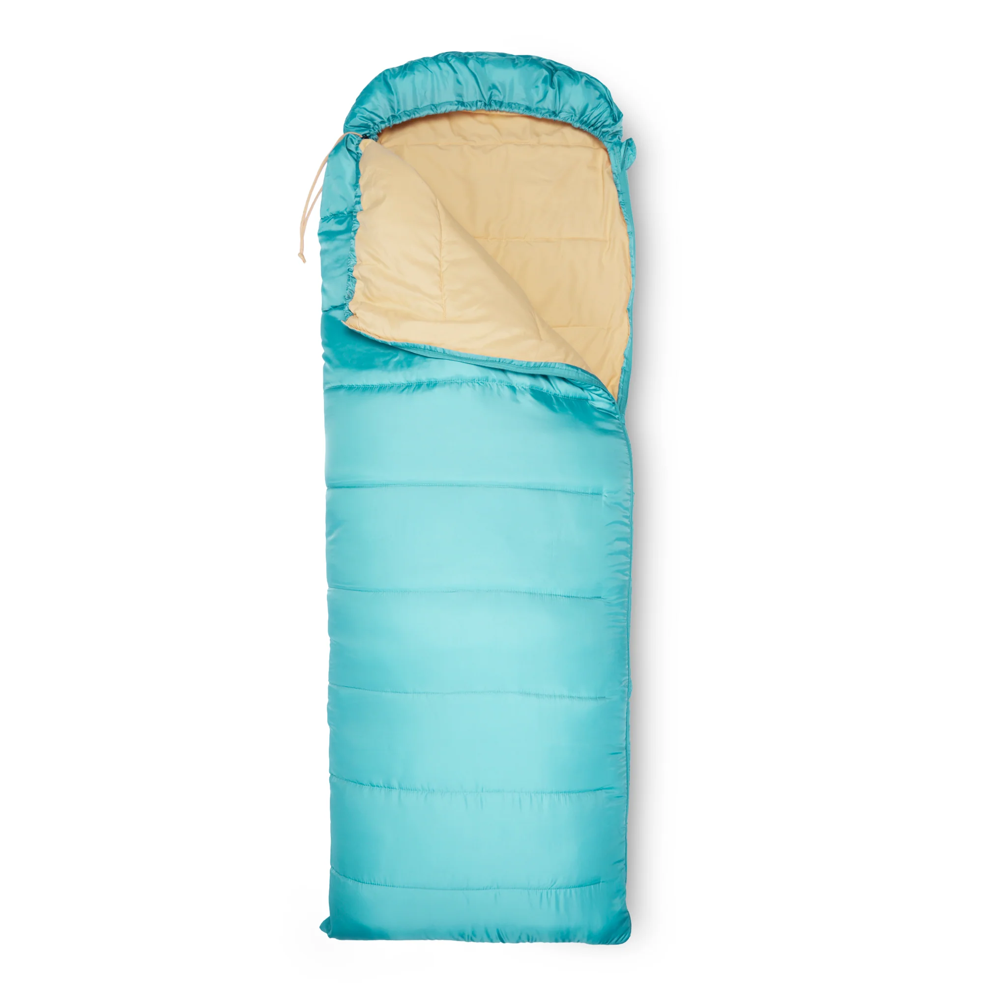 Saco de dormir elaborado para ir de camping o para aventuras en zonas de temperaturas más templadas, forma rectangular.