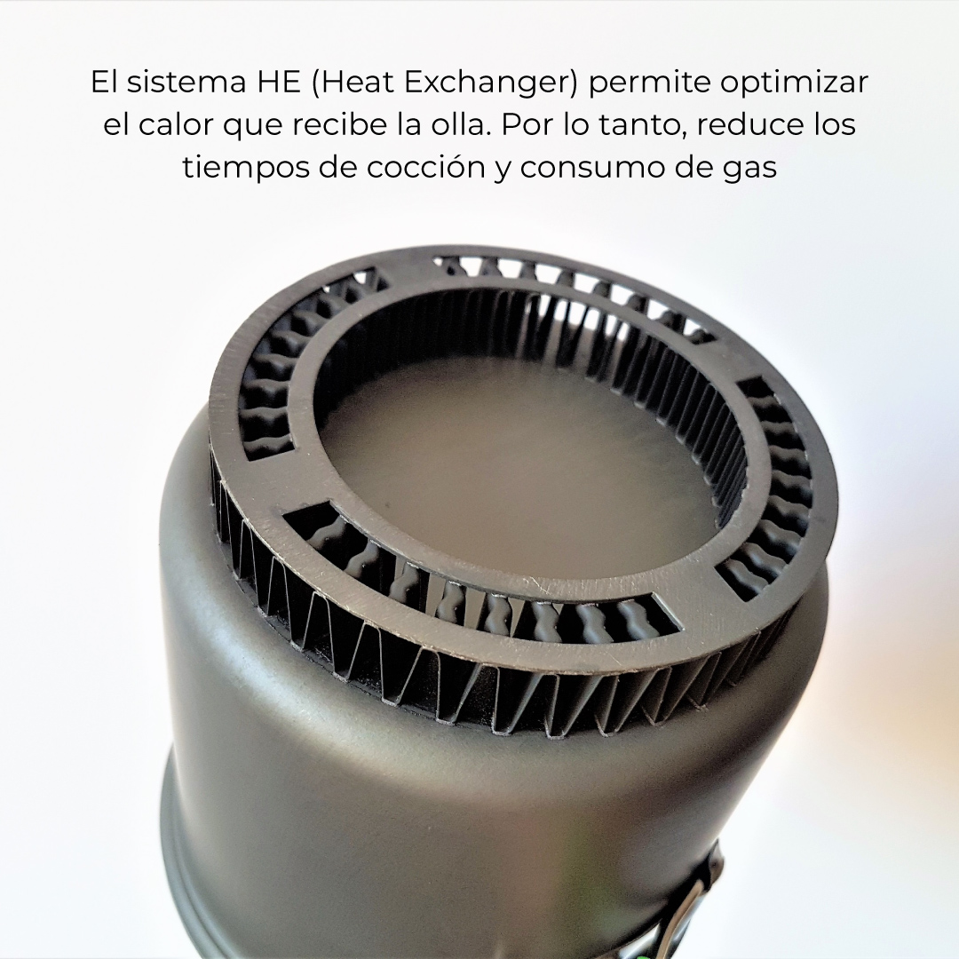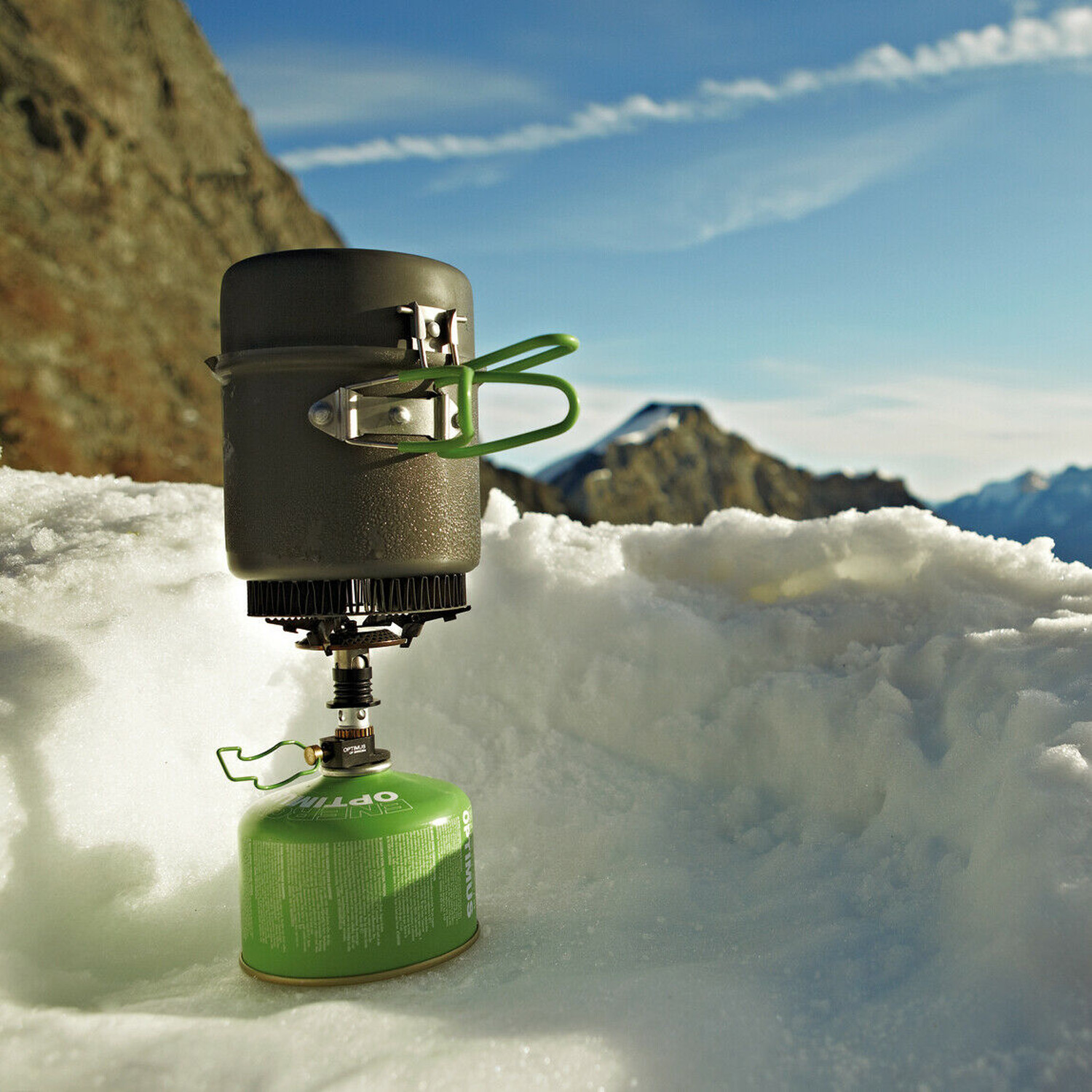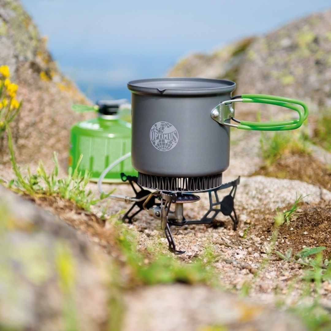 El set de ollas para 1 a 2 personas Terra Weekend HE de Optimus está hecho de aluminio anodizado robusto con una capa antiadherente. Incluye un sistema de optimización de calor HE que reduce los tiempos de cocción en un 20%. Se trata de un set muy ligero que te permite transportar un baloncito de gas y una cocina plegable Crux en su interior.