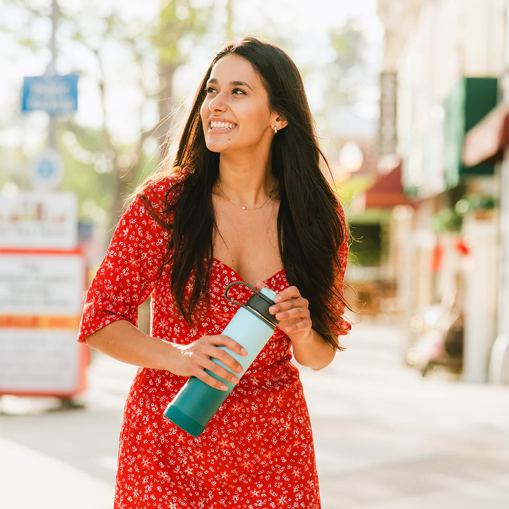 - La tapa de doble apertura cuenta con una boca ancha para facilitar el llenado y una boca pequeña para beber.
