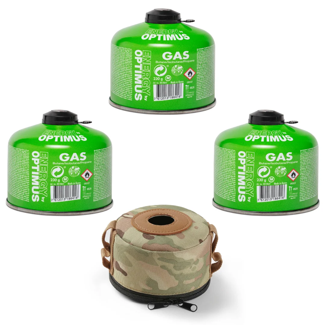 Con este pack podrás equiparte con tres unidades del gas portátil Optimus de 230gr o 450gr y podrás acompañarlas con un cobertor con diseño militar. El cobertor le dará más estilo a tu set de cocina outdoor, pero también te ayudará a optimizar el consumo de gas al reducir su enfriamiento y también facilitará su transporte por los daisy chains laterales que tiene.